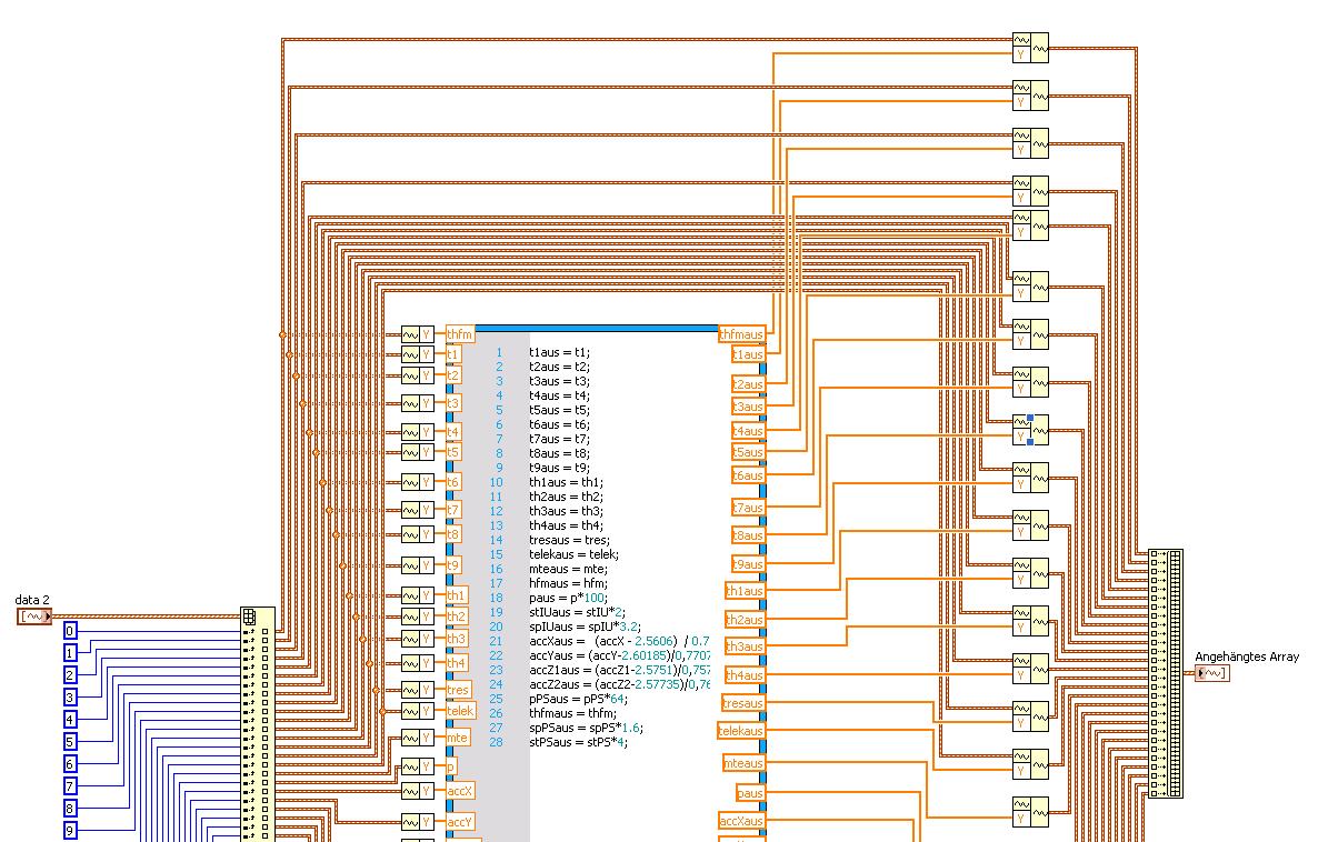 Das Diagram sieht ja schrecklich aus. Wenn Du denn schon sowas machen musst dann doch bitte einfach in einer Case Struktur innerhalb einer For Schleife. Den Case Selector an den Index der For Loop anschliessen und dann kannst Du auch einigermassen vernünftig die entsprechende Skalierung in die richtigen Cases machen, ohne eine Spagetthiorgie zu veranstalten. Das ist ja sonst nicht zum unterhalten wenn da mal ein Kanal hinzukommt, verschiebt oder wegfällt.
