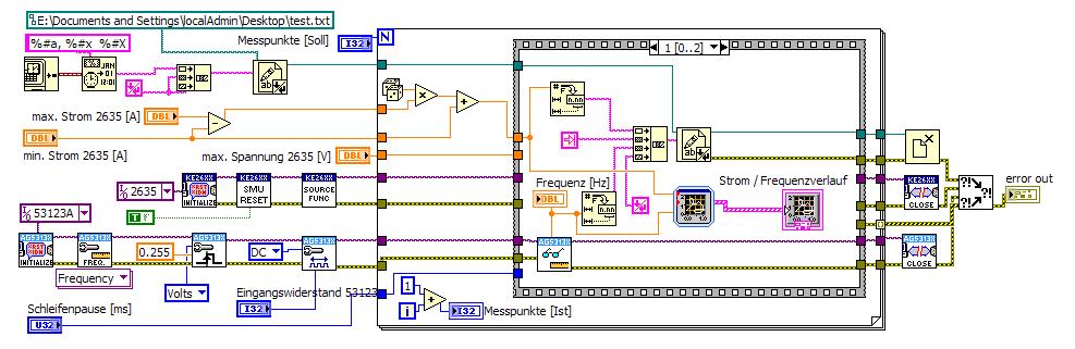 Stromquelle und Frequenzzähler sind per GBIP/100 mit meinem Rechner verbunden. Ich initialisiere das ganze und schicke Random Stromimpulse im Rahmen der zu messenden Randbedingungen rein.
