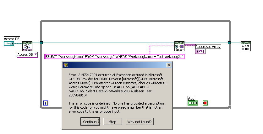 Angefangen habe ich mit [SELECT WerkzeugName FROM Werkzeuge] (also ohne ""), dann bekomme ich als Recordset Array ein 2D Array in dem ich die Datensätze Spalten und Zeilenweise durchgehen kann. Leider habe ich es noch nicht hinbekommen das ganze nach einem Werkzeugnamen zu durchsuchen.