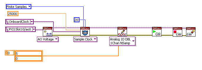für eine Produkt das ich zu testen habe muss ich mit meiner Analog-Karte (PXI-6221) eine Analoges Signal erzeugen das 1-4 Spannungs-Peeks hat. Meine Idee ist nu "einfach" die Samplingrate so anzupassen das ich z.B. mit 1000 Samples/s arbeite und somit ja eine Auflösung von 1ms hinbekommen sollte. Dann noch ein Array mit 1000 Werten erstellen dieses über die Karte ausgeben und gut. Soweit die Theorie;)Dummerweise klappt das nicht.
