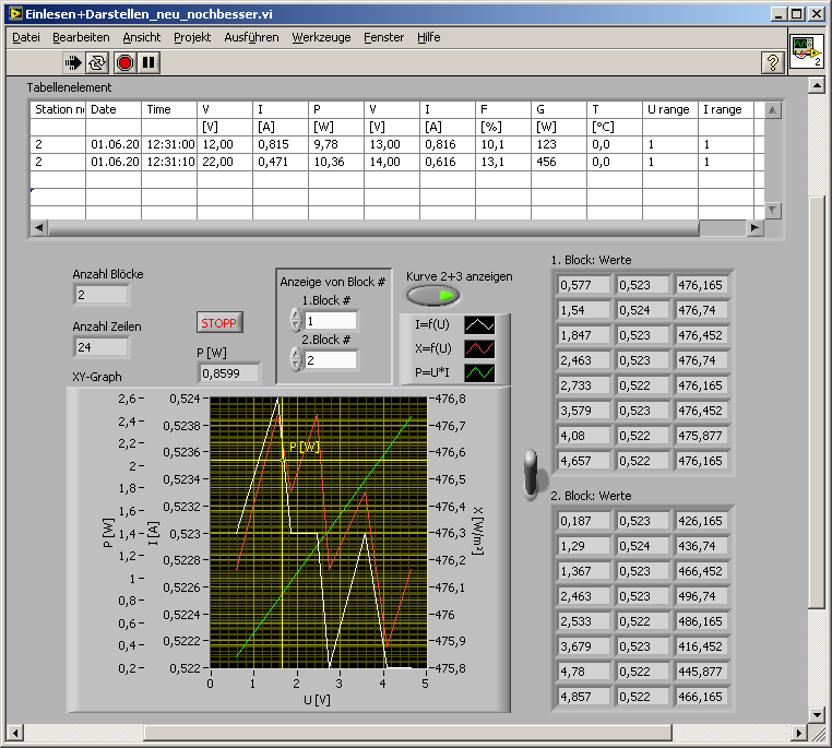 Die Darstellung der Kurve 2+3, also X=f(U) und P=U*I, funktioniert bei eingeschaltetem Block2 gut ... ich sehe grad, dass der Blockauswahlschalter invertiert werden muss. Im Moment zeigt er den falschen Block an., ich bekomm es leider ned hin, dass sie auch bei ausgeschaltetem Block2 angezeigt werden (sprich bei Betätigung des Schalters). ... Versteh ich grad nicht was du meinst. Evtl. hilft dir das: Es wird entweder Block 1 oder Block 2 angezeigt. Kannst Du mir zeigen, wie ich noch ein zusätzliches Diagramm bekomme, wo ich die 3 Verläufe der gewählten Blöcke in einem Diagramm hab? ... also ein Diagramm mit 6 ähnlichen Kurven? wird ganz schön unübersichtlich. Aber zum Testen nimmst du die "Array erstellen" Funktion aus dem "Kurve2+3 anzeigen" Case (Strg gedrückt halten, linke Maustaste gedrückt halten, wegziehen -> VI kopiert) und verbindest beide Eingänge in dem Block-Auswahl Case. Dann hast du einen Case, in dem alle 6 Kurven in ein Diagramm kommen.