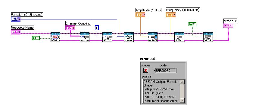 Ich dachte mir, dass es sinnvoll wäre, nach der Initialisierung des Gerätes die Kopplungsart festzulegen (als Beispiel auf beiden Känalen das gleiche Signal). Da es meines Wissens dann ausreichend ist nur den Kanal 1 anzusprechen, aktiviere ich diesen und möchte die Funktion, Amplitude, Frequenz und Phase definieren. Sowohl die Initialisierung, als auch die Kopplung werden ohne Fehler abgearbeitet, erst beim Setzen der Funktion erhalte ich dann eine Fehlermeldung und das war es dann.