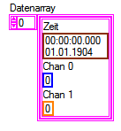 Natürlich kann man dann die im Beispiel verwendeten Funktionen "Array in Cluster" und "Cluster in Array" nicht verwenden, aber der Zeitkanal muß ja ohnehin sonderbehandelt werden, denn er soll ja im Graphen als X und nicht als Y-Achse benutzt werden.