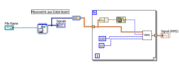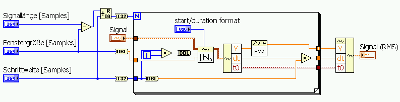 Nein. So wäre die Schrittweite des Fensters "1 Sample" (Bei entsprechender Benutzung der Eingänge Start/Dauer beim VI "Signalausschnitt lesen"). Das ist zuviel des Guten. So hoch aufgelöst muss das RMS-Signal nicht sein. Die Schrittweite soll in Samples angegeben werden können. Die Anzahl der Durchläufe ergibt sich daraus wie oft die Schrittweite des Fensters in den Signalblock passt.