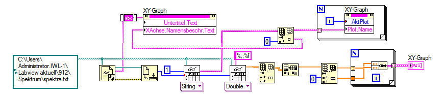 Und zwar verstehe ich nicht, wie ich jetzt das .vi auf die weiteren Daten erweitern kann. Greife ich nach der "array indizieren" Funktion, meine nun gewonnen Arrays ab, dann bekomme ich unterschiedliche Typen von Arrays. Einmal ein Zeilenarray und am nächsten Array ein Spaltenarray. Auf dem Weg der Erkenntnis lasse ich mir mal das Array VOR der Array indizieren Funktion anzeigen. Da hab ich ja eig schon alles schön geordnet vorliegen, also Spalte 1 sind meine x-Werte, in den darauffolgenden Spalten stehen jeweils die Y-werte für einen Graphen. Das einzige was ich meinem Verständnis nach noch zu tun hätte, wäre jeweils Spalte 1 eine weitere Spalte zuzuorden. Das bringt mich bei meinen 13 Spalten zu 12 Arrays, die jeweils x und y Werte enthalten. So ganz verstehen tu ich es offensichtlich noch nicht....!