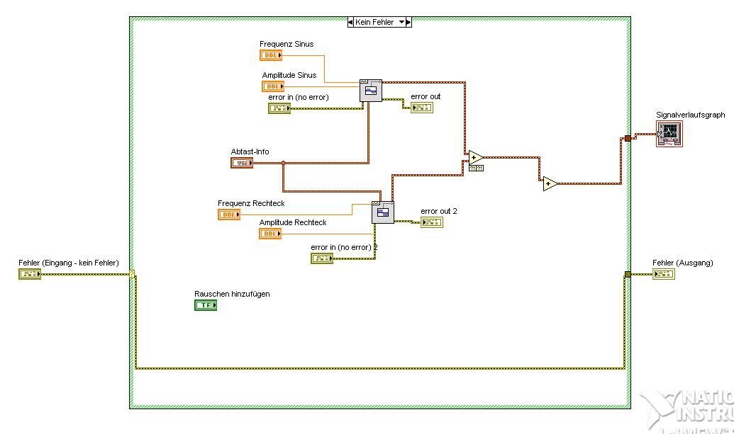 Es soll so funktionieren ,dass man über eine strikt typdefinierte Enimeration die Signalverknüpfung auswählen kann und das Programm dann auf Sub-Vis zurückgreift. Das ganze soll in einer While-Schleife sein. Zusätzlich kann man dann noch auswählen, ob eine Glättung bzw. ein Rauschen eingefügt werden soll.