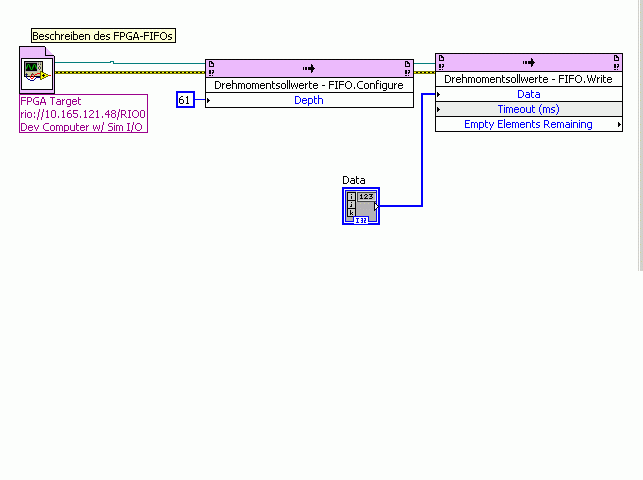 Hier gehts es eigentlich nur darum, die grundsätzliche Funktion zu testen. Nachdem also vom Host der FIFO gefüllt wurde (mit einigen Werten aus dem Frontpanel), sollte ich so über Drücken der Taste "Next" auf dem Target vi nach und nach alle Werte auslesen können, mit zusätzlicher Kontrollanzeige wie viele Werte noch im FIFO vorhanden sind. Genau das funktioniert aber auf dem realen Target nicht, bei der Simulation/Emulation auf dem Dev Computer schon. Und genau das verstehe ich nicht.