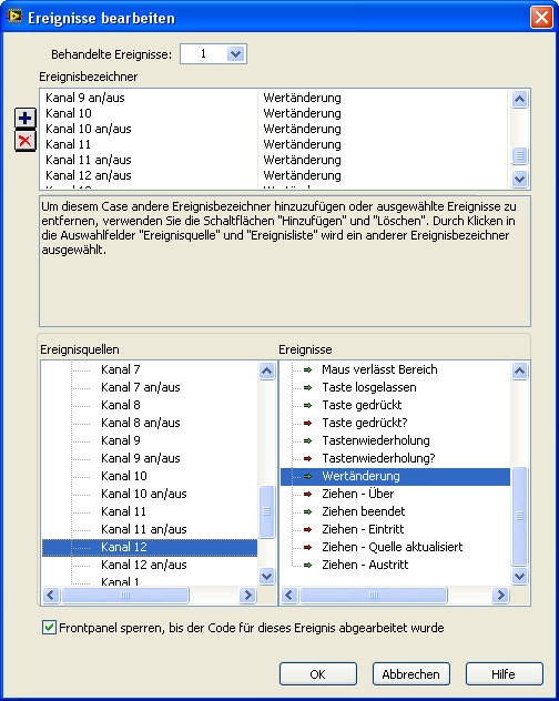 Und jetzt endlich meine Frage: Gibt es eine Möglichkeit, sich das zusammenklicken der Ereignisse zu vereinfachen? Ich habe momentan "nur" 13 Kanäle (macht 26 Ereignisse, siehe Anhang). Wenn ich an die Erweiterung auf 40 Kanäle denke, wird mir ein wenig schummrig. Außerdem scheint mir das ganze vom Programmierstil her reichlich unelegant. Auch das ändern bzw. debuggen wird wahrscheinlich unschön.
