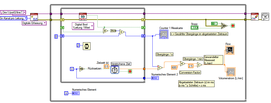 Das digitale Signal wird dann in ein analoges umgerechnet. Das heißt, LabVIEW registriert und zählt 209 Impulse und rechnet es in 5 L/min um. Das funktioniert soweit.