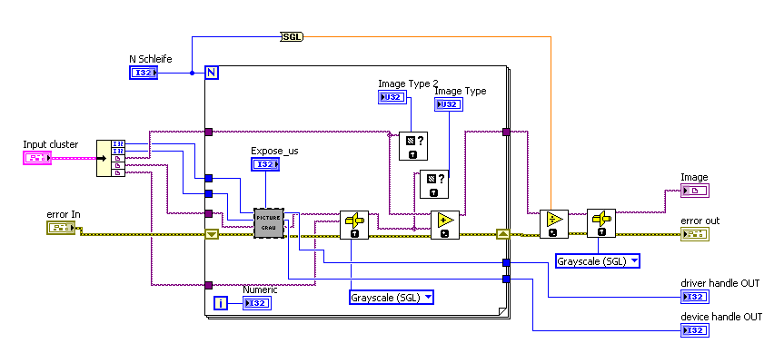 So auf den ersten Blick hast du alles korrekt nachgebaut.KA, wieso das bei dir nicht so funktioniert, wie es soll. Was kommt eigentlich bei deinen Matrox-VIs für ein Wertebereich raus? Der Ausgang ist ein U32-Array.