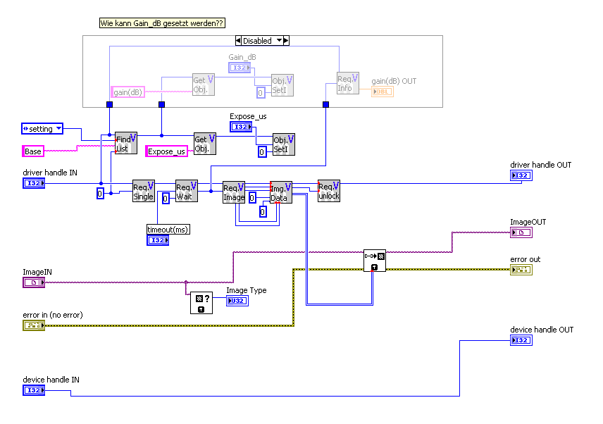 ' schrieb:Du solltest auf jeden Fall das Shift-Register mit einem leeren Array initialisieren. Anderenfalls werden alle Bilder während einer LabVIEW-Session aufsummiert. Das Shift-Register "vergisst" nicht von VI-Aufruf zu VI-Aufruf.