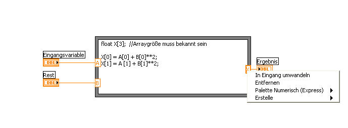 Habe eine kleine, banale Frage: Ich möchte Formelknoten in meinem Programm verwenden; Das Problem ist nur, dass ich bei einem Formelknoten bei den Ein-und Ausgängen nur Double vom Datentyp einstellen kann. Vom MATLAB-Skript her bin ich es gewohnt, dass man mit Rechtsklick auf den entsprechenden Ein- oder Ausgang den Datentyp wählen kann. (Leider kann ich keine MATLAB-Skripte mehr verwenden, da die später erstellte exe-Applikation auch auf Rechnern ohne MATLAB lauffähig sein soll!)
