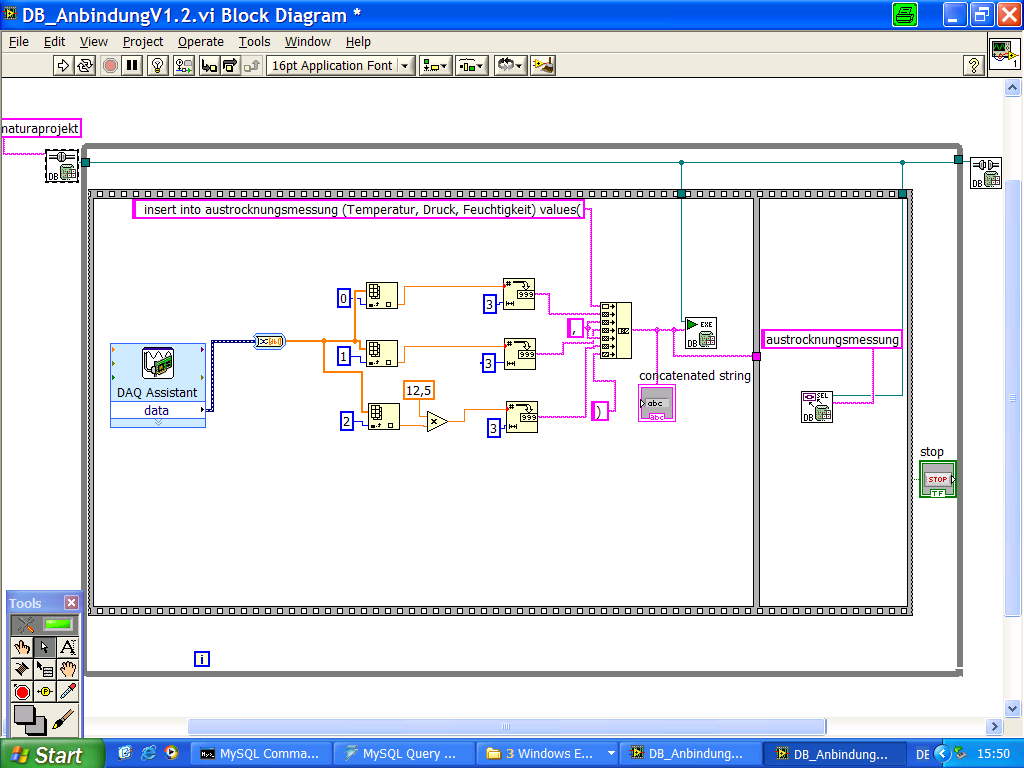 Es werden bei dem Programm Werte von einer Schaltung (Sensor) empfange und in eine Datenbank (mySQL) geschrieben. Das funktioniert ja schon mal ganz gut. Jetzt möchte ich aber die Werte die in der DB stehen in das Programm holen und mittles eines XY-Plote darstellen. Ich komme einfach nicht weiter. Wie wandle ich die Werte weiter damit LabVIEW damit klar kommt und wie verwende ich den XY-Plot richtig damit der die richtigen Spalen erkennt und sie auf die x u y spalte umsetzt?