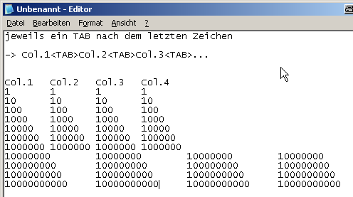 Was du auch noch machen könntest, wäre ein Formatstring von %18s zum Speichern der Tabelle bei gleichzeitigem Einsatz eines Space als Trennzeichen (siehe Contexthelp der Speicherfunktion). Dann ist wieder alles schön untereinander, aber du hast halt sehr breite Spalten... (siehe Anhang) Außerdem wird der Import in Excel schwieriger, aber da bist da anscheinend weniger dran interessiert.