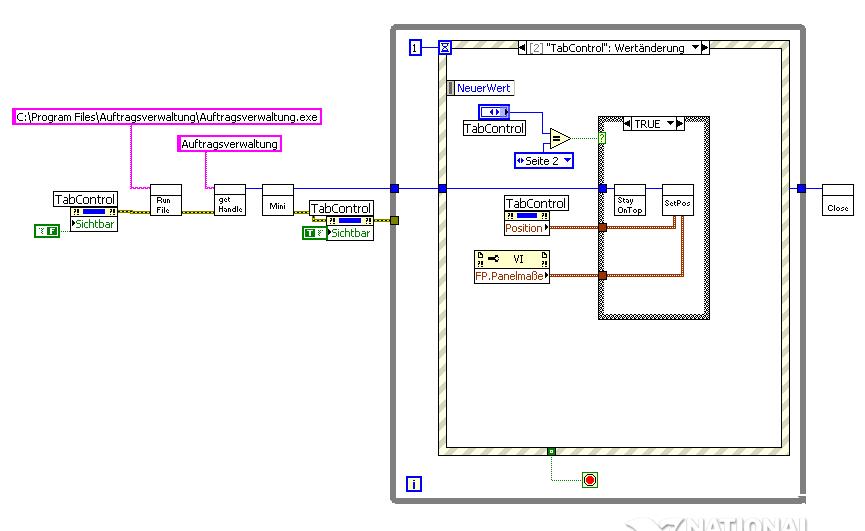 Aber leider wird das Programm nun sofort bei Programmstart des LV-Progs. geöffnet und als eigenes Fester über die LV Anwendung geblendet. Ich möchte es so haben, dass es nur eingeblendet wird wenn man einen bestimmten Reiter in der Registerkarte anwählt und dann wieder ausgeblendet wird wenn man einen anderen Reiter auswählt.
