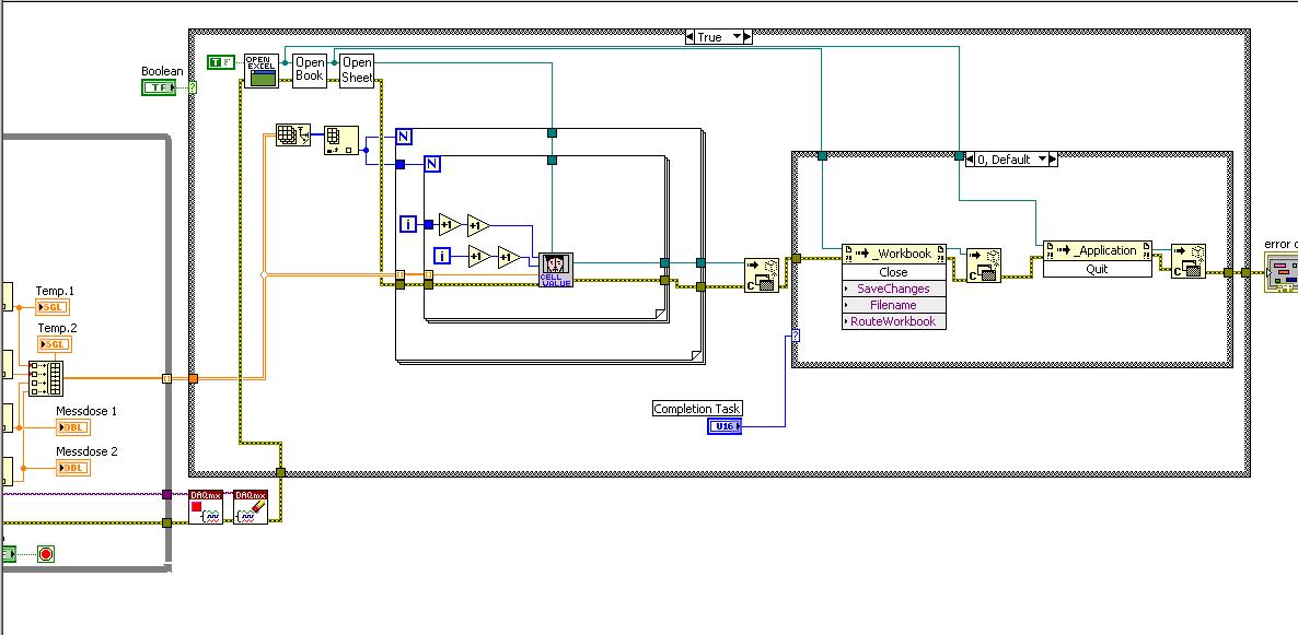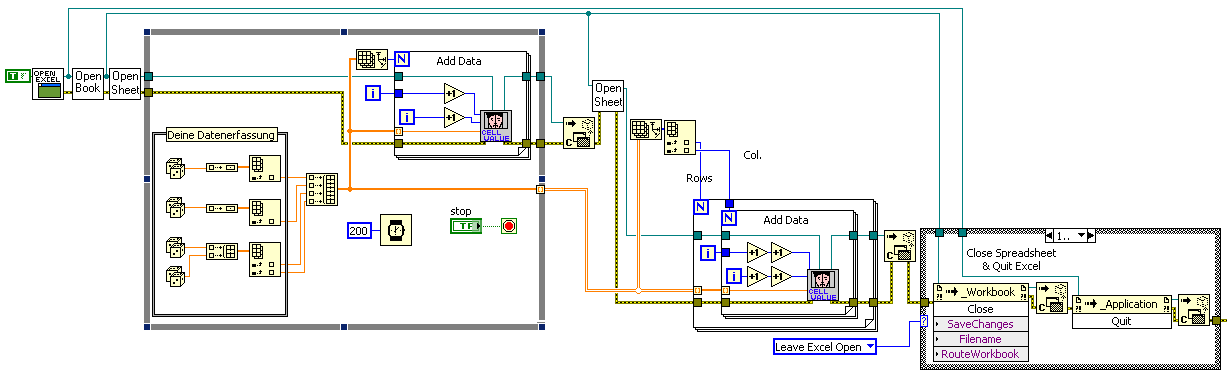 Ein Problem auch könnte sein, dass der ErrorCluster vom DAQmx zu den Excel-Funktionen weitergeführt wird. Tritt ein Problem bei DAQ auf, kann es passieren, dass die Excel-Funktionen "nichts" machen...