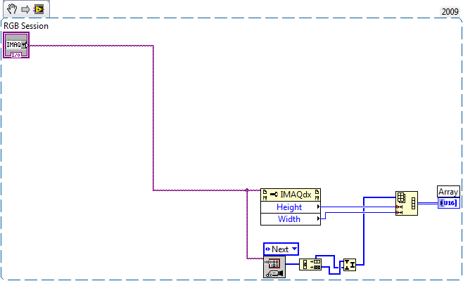 Zuerst nahm ich dazu das normale "Get Image.vi" zur Hilfe und wandelte dann das Image einmal in ein Array um, das Intensitätsbild, dass sich mir dann zeigt zeigt dann aber alles andere als einen Wertebereich zwischen 0 und 4095, Also versuchte ich es weiter mit dem "Get Image Data.vi", das der Hilfe nach zu Folge die Bytes der Rohdaten liefert. Im 1D Ausgangsarray das scheinbar 2 Bytes pro Pixel erhält (wie erwartet) tausche ich nun jeweils diese beiden Bytes und überführe es via. reshape zu einem 2D Array, das ich mir anzeigen lasse. Das liefert mir ein schönes Intensitätsbild mit einem Wertebereich von 0 bis 4095. Nun weiß ich allerdings nicht wie ichdaraus nun die Farbkanäle extrahieren soll bzw. was mir denn da nun exakt geliefert wurde.