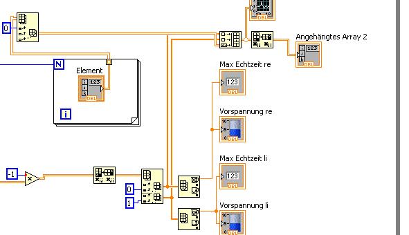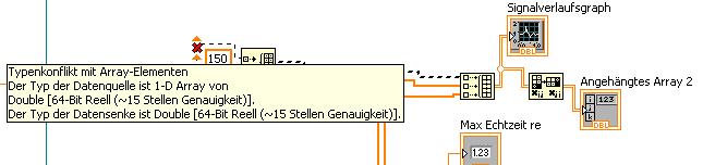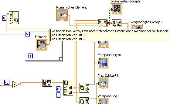 Vielleicht daran, dass wir in dem Bild nicht erkennen können, wo du was verdrahtet hast? Warum (scheinbar) die "150" nicht mit dem InitArray verbunden werden kann? Vielleicht würde es ja helfen, die in LV9 durchaus vorhandene Aufräum-Funktion fürs Blockdiagramm ab und zu mal zu benutzen, um zu erkennen, welcher Draht wo lang führt... (StyleGuide: von links nach rechts, gerade Drähte, etc.)