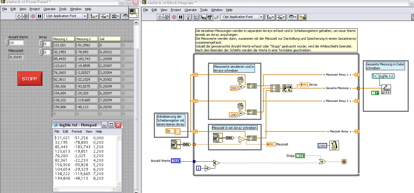 Das Beispiel speichert jetzt "Messwert 1 Messwert 2 Zeit" in die angegebene Datei "C:logfile.txt". Die Reihenfolge der Werte kann leicht durch Ändern der Reihenfolge der Arrays beim Zusammenfassen angepasst werden.