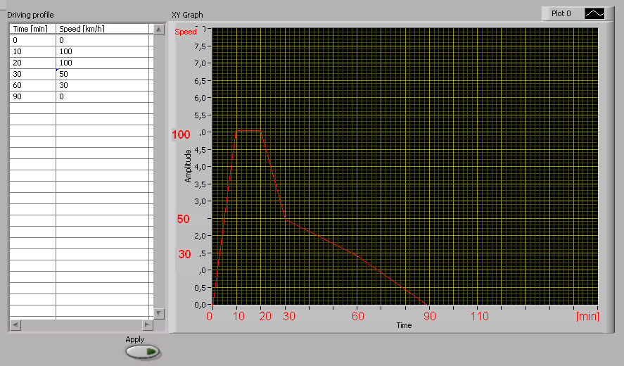 Im Moment macht mir noch etwas Anderes Probleme. Ich möchte dem Nutzer die Möglichkeit geben "Profile" in einer Tabelle einzugeben, also absolute Zeitangaben in Min. und dazugehörige Geschwindigkeitswerte. Diese Werte sollen dann zunächst als Diagramm dargestellt, und später vom Prüfstand "gefahren" werden. Das sollte doch an sich keine so großes Problem sein die Daten aus der Tabelle als Array dem Graphen zu übergeben. Ich würde dann alle X Sekunden den Geschwindigkeitswert aus dem Array heraus-interpolieren und als Sollwert verwenden und dem Prüfstand übergeben. Aber irgend wie passen die Arraytypen nicht ganz zusammen, ich bekomme die Werte nicht im Graphen dargestellt. habt ihr mir vielleicht einen guten Tip welche VI's in Frage kommen?