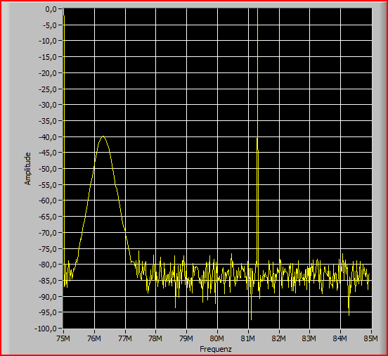 Hier schlecht zu sehen, aber der breitere Peak sollte fest auf 80 MHz stehen, allerdings läuft dann der Graph von links nach rechts durch...