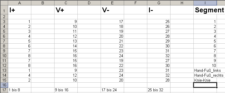 ich bekomme 32 analoge Mess-Signale von einer Bio-Impedanz-Messung geliefert. Diese 32 Signale teilen sich wie folgt auf: jeweils 8 Elektroden messen I+,V+,V- bzw. I- (4*8=32^^). Die 32 Signale teilen den Körper in die 13 Segmente, wie Ihr hier sehen könnt.