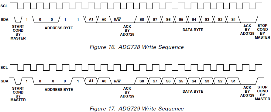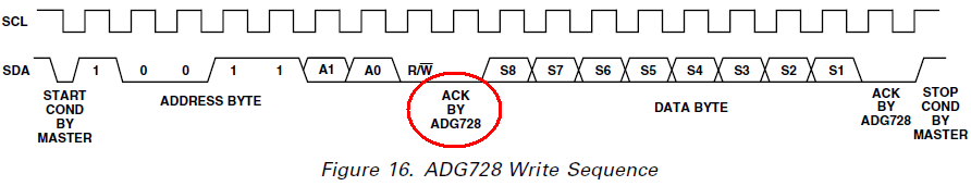 Gefolgt von der Start-Condition folgt die Adressierung eines der ADG728s mit Hilfe einer 7bit-Adresse (die ich selber festgelegt habe über die beiden Pins A1 und A0). Danach kommt das R/W-Bit. Jetzt stehe ich schon vor meinem Problem: Was mache ich mit dem Acknowledge-Bit, das hier markiert ist?