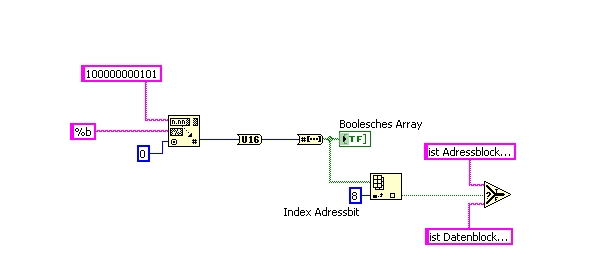 vielleicht hilft dir das Bildchen ein wenig...ich verstehe noch nicht so ganz, was du eigentlich machen willst! Musst du den ersten empfangenen von allen anderen Datenblöcken separieren (in dem das Adressbit als Hinweis "Ich bin der Adressblock" gesetzt ist)? Dann sollte dir die gezeigte Funktion was nützen, da kannst du dann einfach überprüfen, ob das betreffende Bit gesetzt ist...