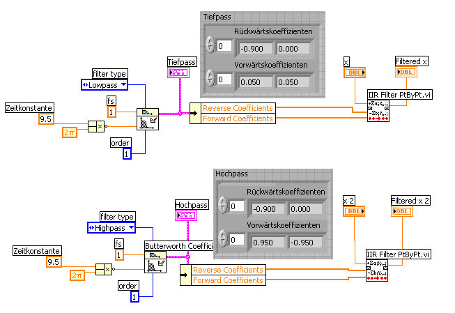 Danach kansst Du Dein eigenes HP- oder TP-VI stricken, für den TP habe ich es mal gemacht und kann es Dir gern schicken. Allerdings ist es einfacher, von LV z.B das "IIR Filter PtPyPt.vi" zu verwenden, siehe oben.