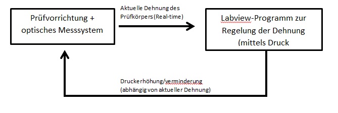 Das ganze soll nun Dehnungskontrolliert gesteuert werden (Bis jetzt funktionierte das ganze Druckkontrolliert: Druck wurde vorgegeben): Der Benutzer kann in einem Labview-Programm eine Unter- und Obergrenze für die Dehnung angeben. Weiters soll die Periodendauer/Frequenz eingegeben werden. Danach sollte der Prüfkörper zwischen den beiden Dehnungsgrenzen SINUS-förmig belastet werden (d.h. die Druckluft muss erhöht/vermindert werden). Vom optischen Messsystem wird in gewissen Zeitabständen (z.B. 10x/sek) die aktuelle Dehnung an das Labview-Programm geliefert. Das Programm soll nun prüfen, wie weit die aktuelle Dehnung von der Ober- oder Untergrenze entfernt ist und anschließend den Druck erhöhen/vermindern (wie gesagt: Das ganze soll zwischen den Grenzen sinusförmig ablaufen, die Erhöhung ist natürlich abhängig von Frequenz der Schwingung).