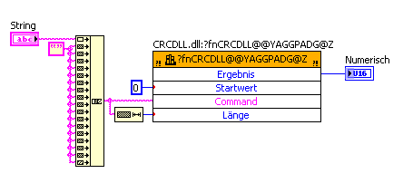 beim Aufruf der DLL kommt es immer wieder zu Abstürzen von LabVIEW, auch wenn ich gar nicht im Debug-Modus bin, sondern Linien im Diagramm ziehe. C++ fügt am Ende eines Strings 0x00 an, um das Ende auch anzukündigen. LabVIEW teilt Funktionen die Länge des Strings am Anfang mit. Da ein String ja ein Array aus charctern ist, dachte ich, so wie im Bild würds gehn. Aber es hilft nicht wirklich. Ich dachte, so kann ich den Array künstlich größer machen bzw. Felder im Array initialisieren, aber mit nichts füllen. Damit wäre dann der Array größer (nicht der String, die Leerzeichen haben die Länge 0) und es wäre genug Puffer für die DLL vorhanden.