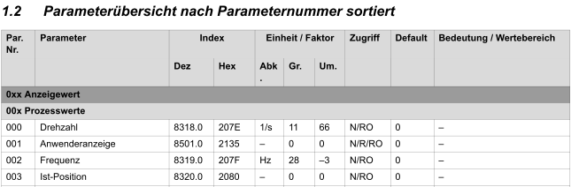Jeder Parameter im FU ist einem Index/Subindex zugeordnet. Wenn du z.B. die Ist-Frequenz lesen willst, musst einen SDO mit Index=0x207F, SubIndex=0 abfragen. Die Einheit des Ergebnisses ist in Hz: einmal ist das direkt dort angegeben, andererseits wird auf Eintrag 28 der Größen-Tabelle verwiesen. Der vom SDO gelieferte Wert muss mit Umrechnung "-3" verarbeitet werden, die zugehörige Tabelle liefert hier einen Faktor von 0.001=1E-3.