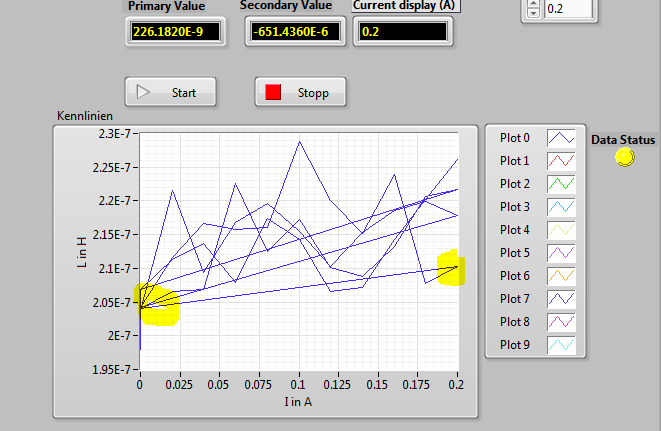 Ich habe noch eine Frage, wenn ich jedes Mal aus Start-button klicke, verbindet die Kennlinie selbst vom letzten Punkt (alter Messwert) zum ersten Punkt (neue Messung) zusammen - wieso? soll ich was ändern?