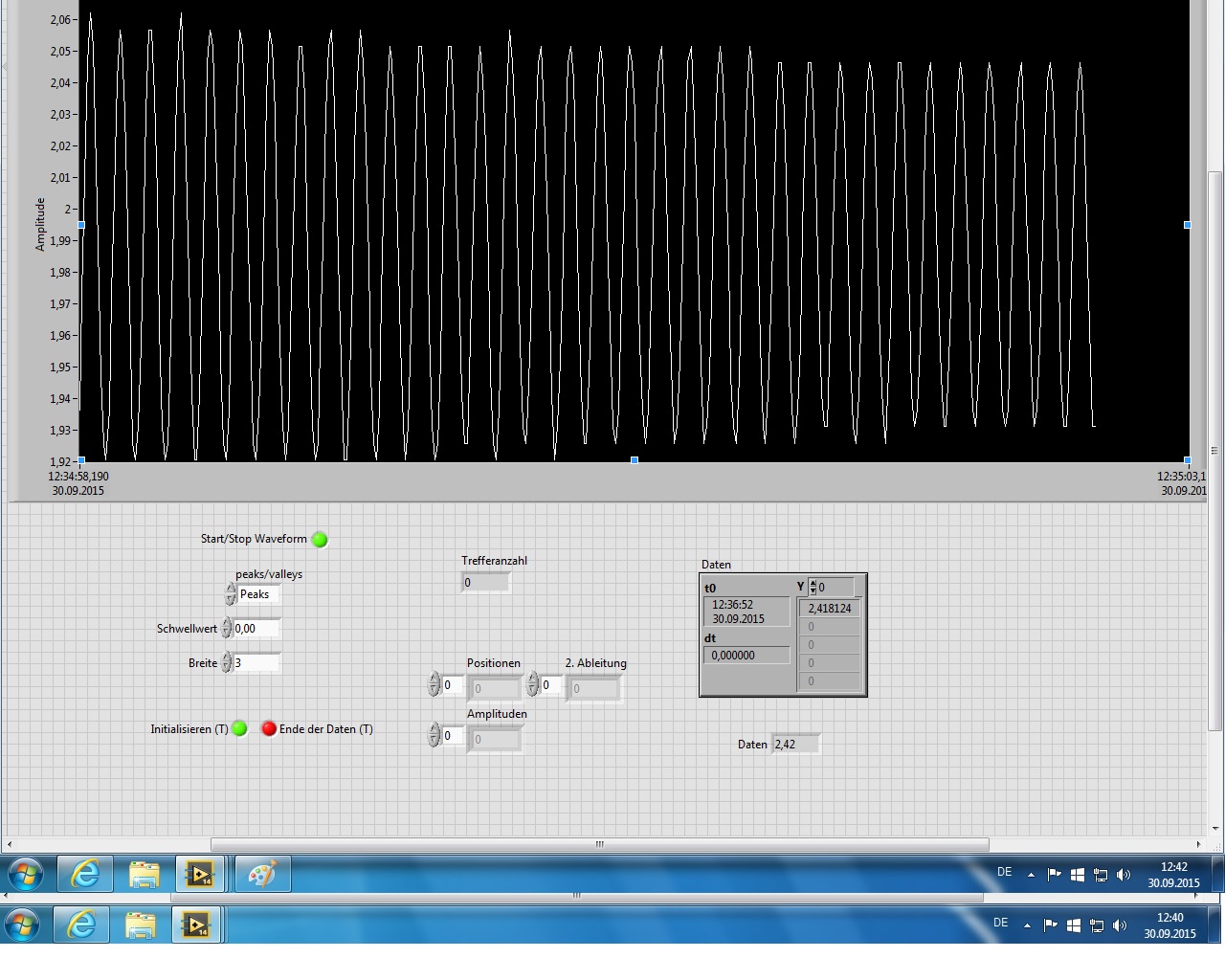 Das Frontpanel zeigt eine Verlaufszeit von 5 Sekunden an. Somit möchte ich über diesen Verlauf von 5 Sekunden die Anzahl der Peaks oder Valleys zählen und diese Anzahl geteilt durch die Verlaufszeit von 5Sekunden ergibt dann die Frequenz (1/s). Bsp: Im Verlauf sind 34 Maxima Punkte diese geteilt durch 5 Sekunden ergibt eine Frequenz von 6,8Hz. Daraus kann man natürlich die Periodendauer usw auch heraus bestimmen.