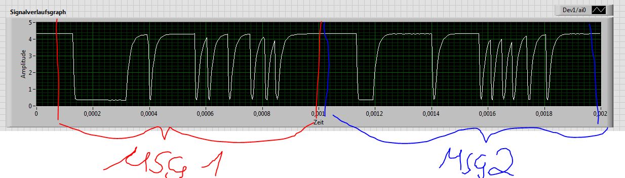 Das Signal lese ich über den Analogkanal ein, leider "wandert" das Signal und flackert, sodass die Messung immer nur zu einer bestimmten Zeit anfängt und dann wieder aufhört und die Messergebnisse hin und her schwanken.