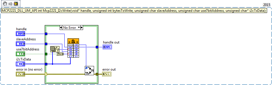Erst einmal, die MCP Library had einen Bug!! Das handle, das alle Funktionen verbindet ist ein Pointer, kein unsigned int. Für 32 bit LabVIEW würde das zwar kein Problem sein, denn dort ist sizeof(int32_t) == sizeof(void*). In 64 bit LabVIEW ist aber sizeof(void*) == sizeof(int64_t).