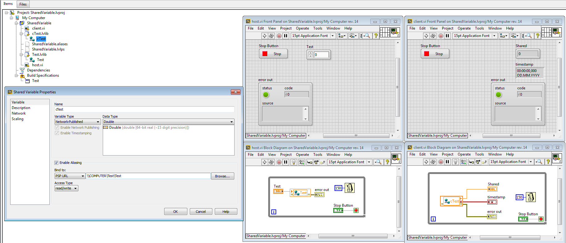 Meine Vorgehensweise (nach NI Beispiel): ich erstelle lokal eine lvlib (Test.lvlib) mit meinen Variablen (Test), eine zweite lvlib (cTest.lvlib) für den Client mit Variablen (cTest), die über PSP (\\COMPUTERNAME\Test\Test) auf die lokalen Variablen zeigen.