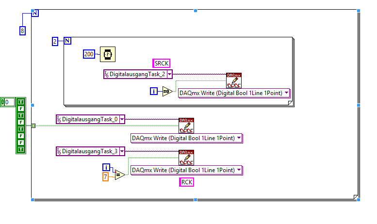 ich habe folgendes Programm zur Steuerung der 8 LEDs gemacht(siehe Bild). Ich weiß das man zur Steuerung des TPIC6b595 Schieberegisters 3 Pins braucht SER_IN (Daten), SRCK(Schieben) und RCK (Übernehmen). Die Daten werden mithife eines Array ermittelt.