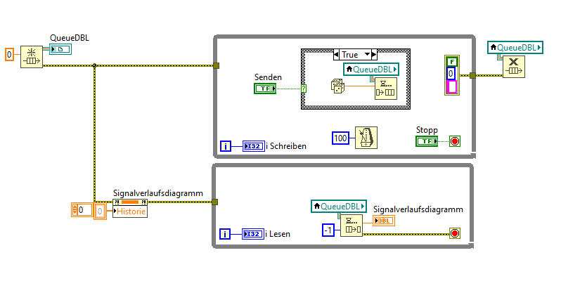 Wenn Du in den Beispielen nach Queue suchst findest Du zB: "Channel Basics.lvproj", dort wird erklärt wie Datenaustausch zwischen parallelen Schleifen auch noch gehandhabt werden kann.