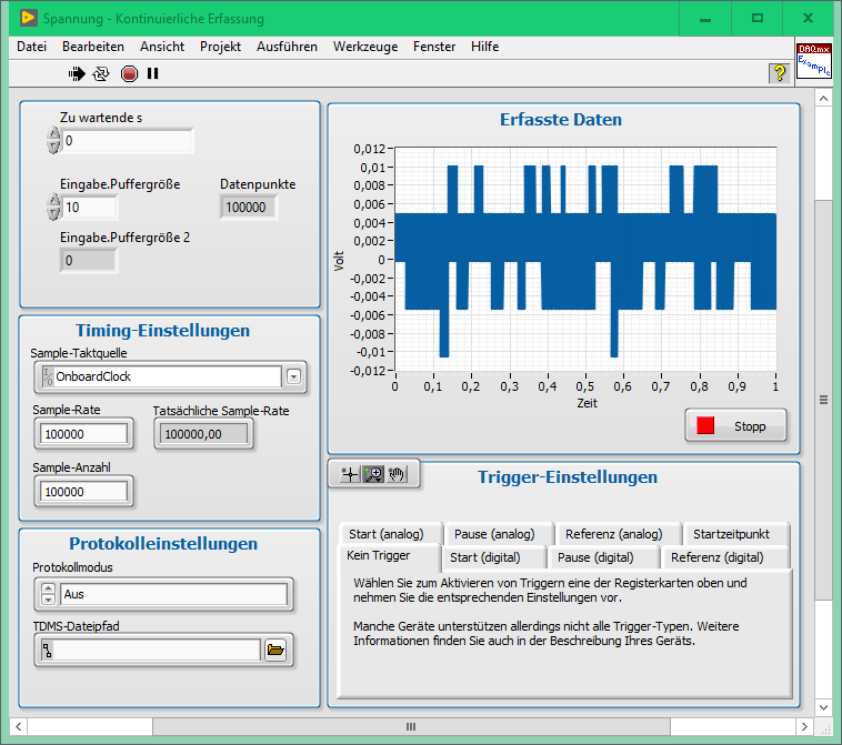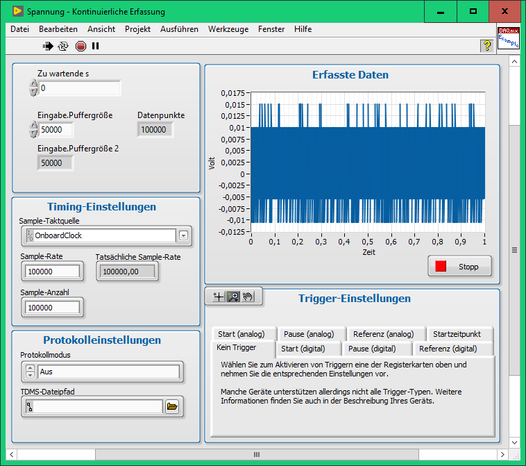Zitat:Zitat:In meinem Beispiel habe ich eine Abtastrate von 100000 S/s und "Samples pro Kanal" von 100000 S. Dann setze ich die Puffergröße manuell auf 50000 S und das funktioniert. Das sollte es jedoch nicht; ich erhalte einmal pro Sekunde 100000 Werte.