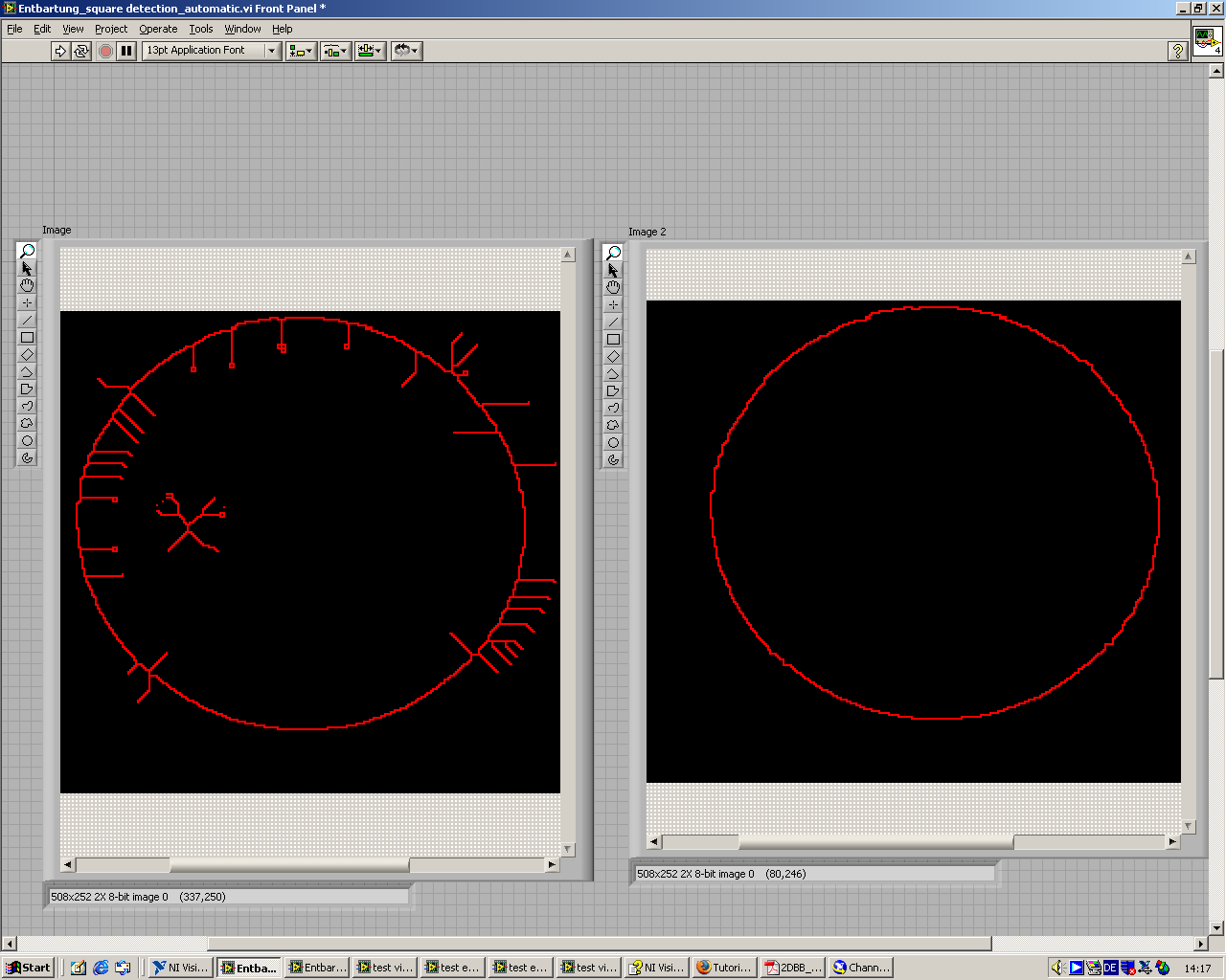 Zuerst muss ich das vorgegebene Bahnmuster einlesen. Das Einlesen klappt soweit auch ganz gut und die weitere Bearbeitung mit NI-Imaq Vision auch. Allerdings muss ich aus dem bearbeitetem Bild (Highlight details ----> Threshold --> Dilate objects ----> Erode objects --> Skeletton --> Entbartung) die genauen x y Koordinaten des skeletierten Kreises bekommen. Image2 ist der fertig bearbeitete Kreis. Hat jemand vielleicht eine Ahnung wie man das mit Imaq Vision oder LabVIEW hinbekommt.