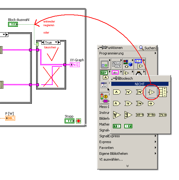 Invertieren -> also entweder den boolschen Wert des Schalters negieren oder die Kabel in dem Blockauswahl Case tauschen.