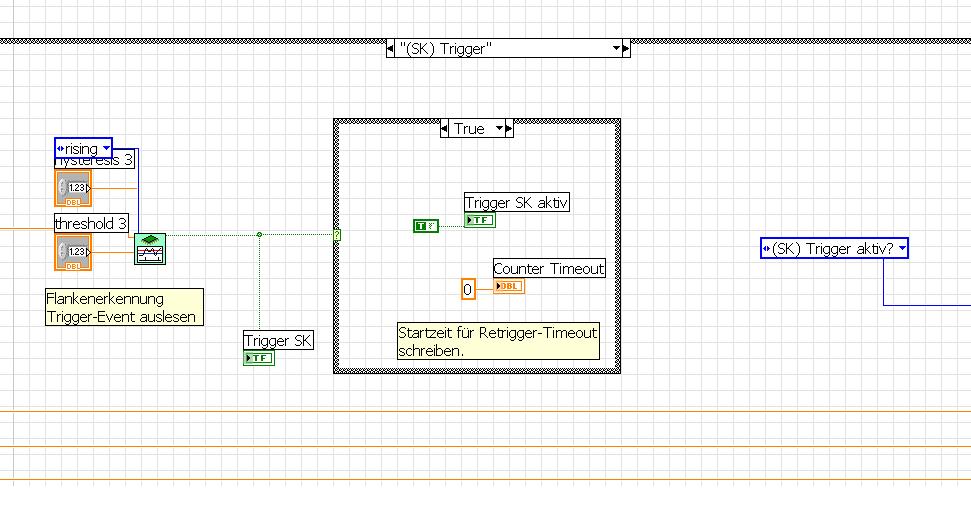 Hallo zusammen. Mein Programm ist immer noch nicht voll funktionsfähig. Für die die jetzt erst einschalten, ich lese Messwerte mit einer DAQ-Karte aus und verarbeite danach jeden Wert einzeln. Das im Groben. Nun zu meinem Problem. Im Anhang befindet sich ein Ausschnitt aus meiner Statemachine. Ich möchte erreichen, dass ich ein Signal generiere, welches beim ersten Triggerevent gesetzt wird und erst an einem bestimmten Punkt im Programm zurückgesetzt wird. Eig dachte ich das es mit der im Bild dargestellen Methode funktioniert. Feuert der Trigger ist mein Case true jedesmal ein Trigger erkannt wird. Ach und der FALSE-Zweig ist leer.