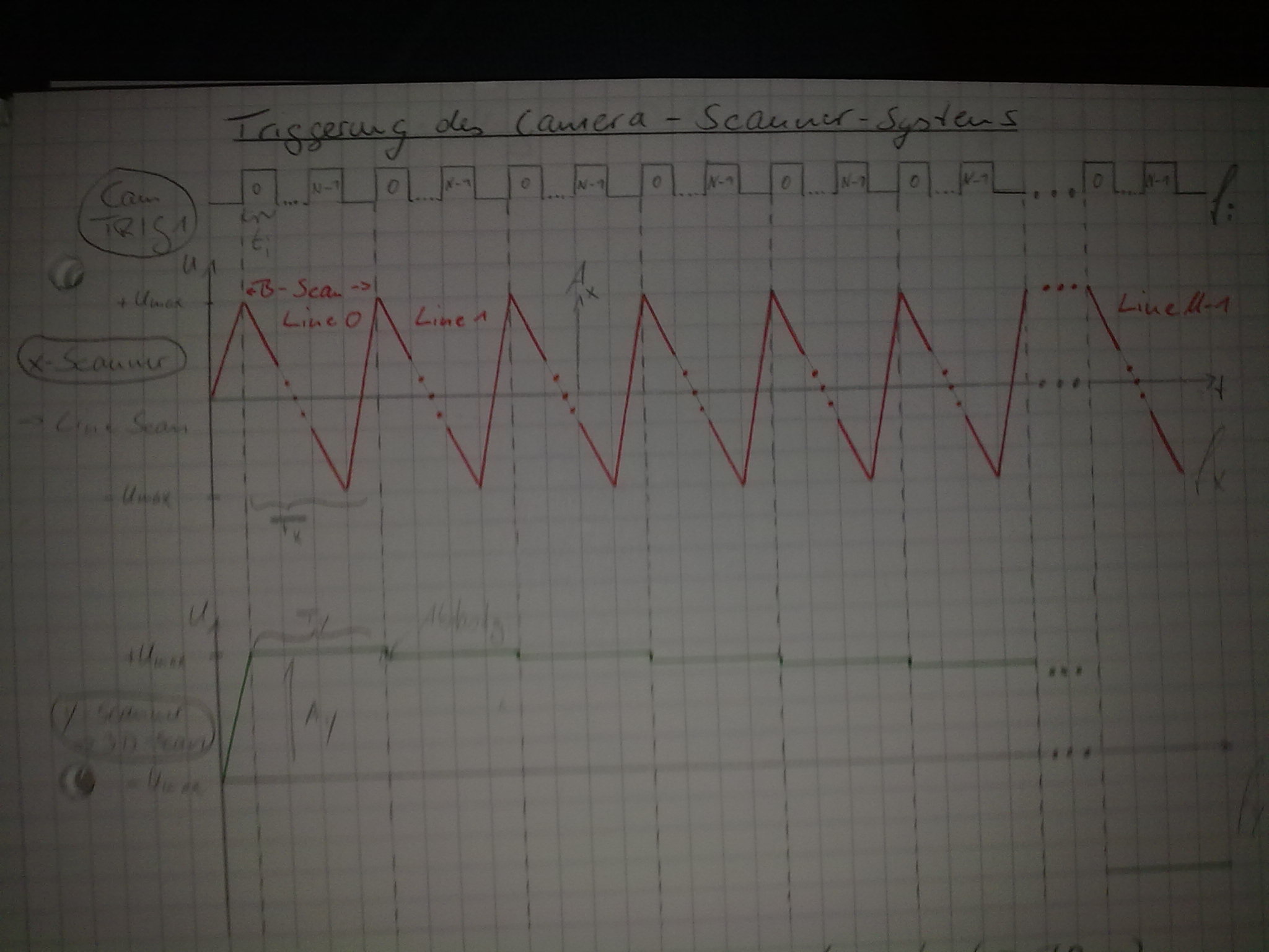 ich bin relativ neu im Umgang mit LabVIEW (seit September 2010) und arbeite zur Zeit an meiner Bachelorarbeit. Dazu muss ich ein Programm erzeugen, welches über zwei DAQmx Channel jeweils ein analoges Signal (Output) an einen galvanometrischen XY-Scanner übergibt. Die Signale müssen absolut synchron laufen. Das Signal für den x- Scanner soll eine Sägezahnspannung sein und für den Y-Scanner eine Treppenfunktion. Eine Skizze ist im Anhang enthalten (soory wegen der Quali - das Bild wurde mit dem Handy gemacht).