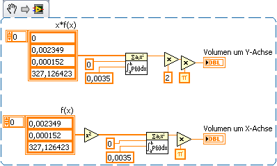 Rotation um die Y-Achse: V=2*pi * [Integral über (x*f(x) dx) im Bereich von 0 bis 0.0035]