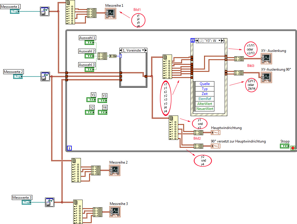Habe das Programm versucht zu ändern ohne erfolg. Beim Start des Programms werden die Messdaten schon vorher weiter gegeben und Graphisch abgebildet wegen der 1. Voreinstellung im Case Struktur. (siehe Bild 4). Das sollte nach einer Auswahl geschehen. Wählt man anschließen ein Auswahl 1-3 Button passiert als erstes nichts, bis später mit Y1-Y4 ein Auswahl getroffen wurde. Sobald aber ein zweiter Y 1-Y4 Botton gedrückt wird startet das Programm mit Case 1.Voreinstellung erneut und nicht mit dem Ausgewähltem Button.