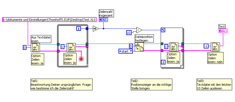 Die Datei wird von einer einzigen Schleife erstellt, die sich ungefähr 16000 mal wiederholt, bis dann der Sollzustand eintritt. Ich werde dann mal Versuchen die ganze Datei zu laden, dann den String umdrehen und so dann die ersten Zeilen auslesen. Falls du eine bessere Lösung hast, kannst du sie mir gerne mitteilen.