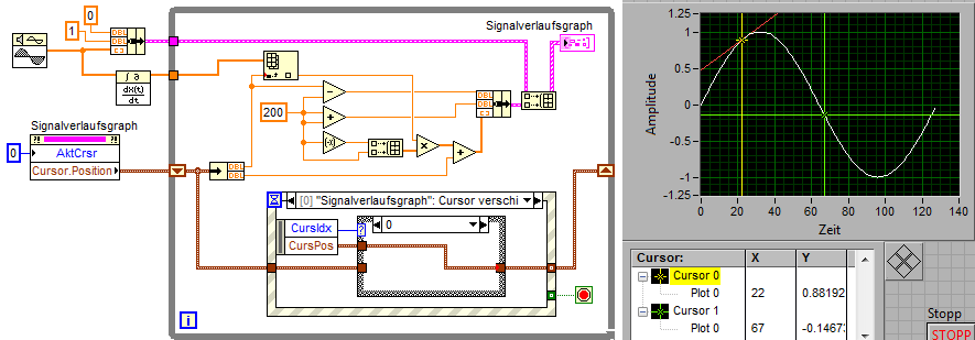 Für die Länge der Tangente gibt es ein einfache und eine komplizierte Lösung. Die einfache ist: Die "20" im VI einfach zu vergrößeren, z.B auf 200. Nachteil: Man darf dann kein Autoskaling im Diagranmm verwenden. Die komplizierte Lösung ist, für die beiden Endpunkte der Tangente immer Koordinaten an der Diagrammgrenze zu nehmen. Das ist machbar, es wird nur etwas komplizierter dadurch, daß die Tangente entweder an ein X- oder ein Y-Bereichsende stoßen kann, und dementsprechend sind Fallunterscheidungen für beide Punkte vorzunehmen.