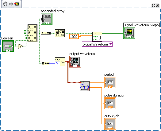 Bekommst du doch schon: "Period" ist die Periodenlänge = Zeit zwischen 2 Impulsen! Wenn du beim BuildWaveform noch ein (korrektes) dt vorgibst, bekommst du hier auch gleich eine (vernünftige) Zeitangabe geliefert...