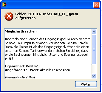 Beim Wegaufnehmer funktioniert's. Bei der Frequenzmessung (CI "Frequenzmessung mit einem Counter") hat's mit der simulierten Karte funktioniert mit der richtigen Karte bekomme ich folgende Fehlermeldung: